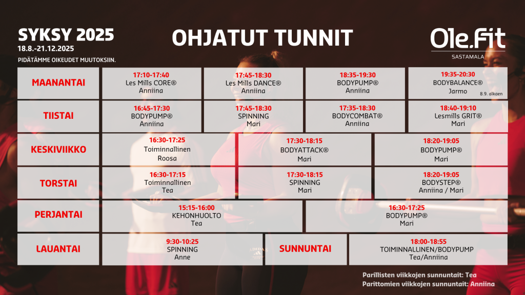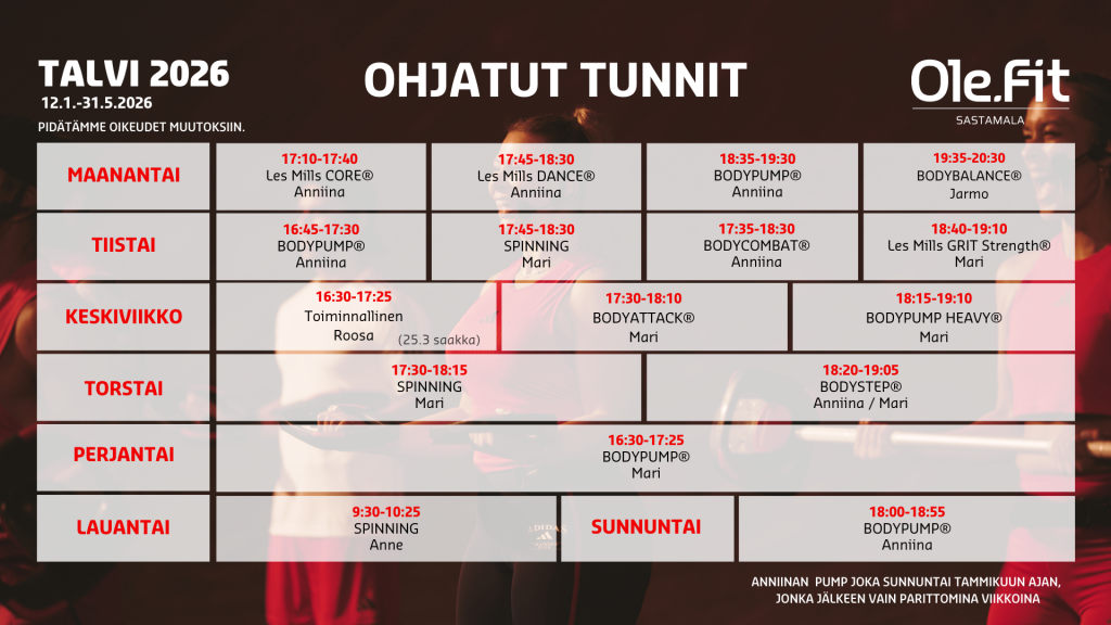 Liikunnan ilo ja yhdessä tekemisen voima odottavat sinua! Ole.Fit Sastamalan monipuoliset ja innostavat ohjatut tunnit tarjoavat jokaiselle liikkujalle mahdollisuuden nauttia liikunnasta omalla tasollaan – olitpa sitten aloittelija tai kokenut treenaaja.